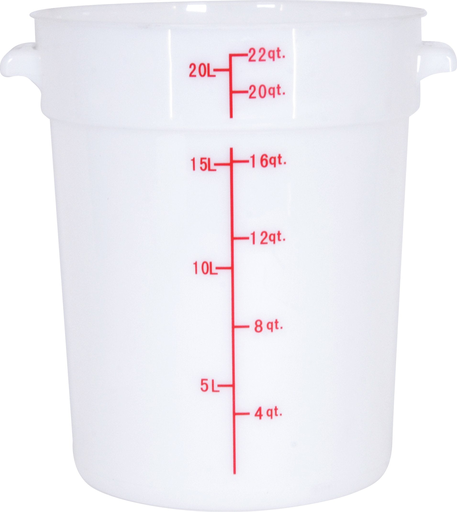 This durable Polypropylene round storage container, provides sanitation and longevity. It is resistant to acids, oil and alcohol. The container comes with both metric and imperial measurements. This container can withstand temperature ranges from -15°C to 80°C.