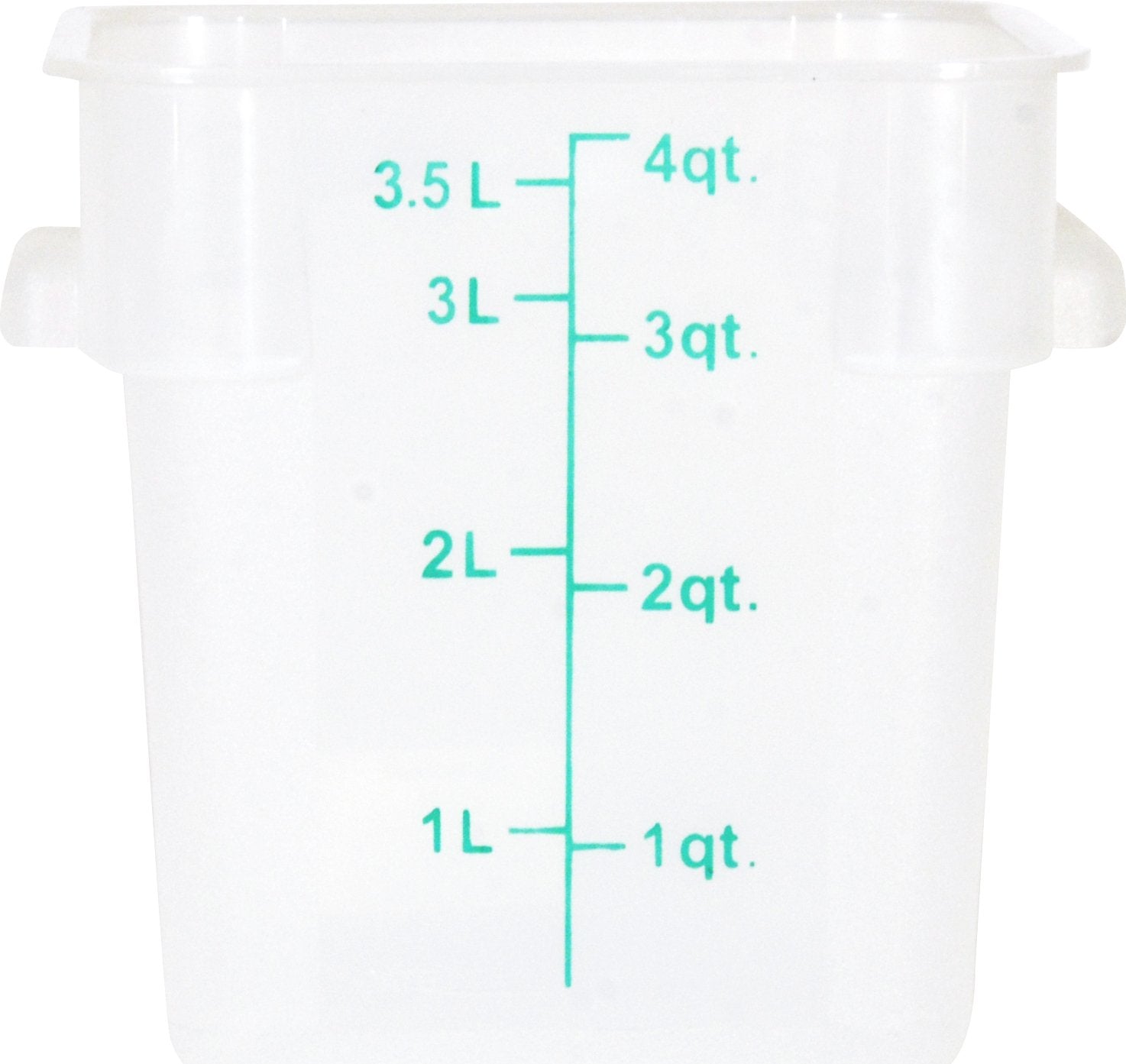 Keep your fruits, vegetables, sauces, spices, dry ingredients, wet ingredients etc. fresh while maintaining proper portions with this square food storage container. It is durable and offers reliable portion control with the coloured measurements that are printed directly on its exterior surface. Measurements are in both metric and imperial. Its square design maximizes storage space when compared to a round container. In addition to being dishwasher-safe, it can withstand temperature ranges from -15°C to 80°C.
