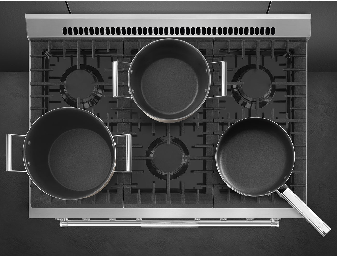 Dressed in a sleek satin-finished stainless steel, this range exudes sophistication and durability. The robust knurled handle, brushed stainless steel accents, and pro-style control knobs not only enhance functionality but also reflect a commitment to exceptional craftsmanship. Navigate your culinary journey effortlessly with the stainless steel control panel and integrated black enamel cooktop. Whether you're simmering, sautéing, or baking, the SMEG Professional Range provides the precise control you need to bring your culinary visions to life.