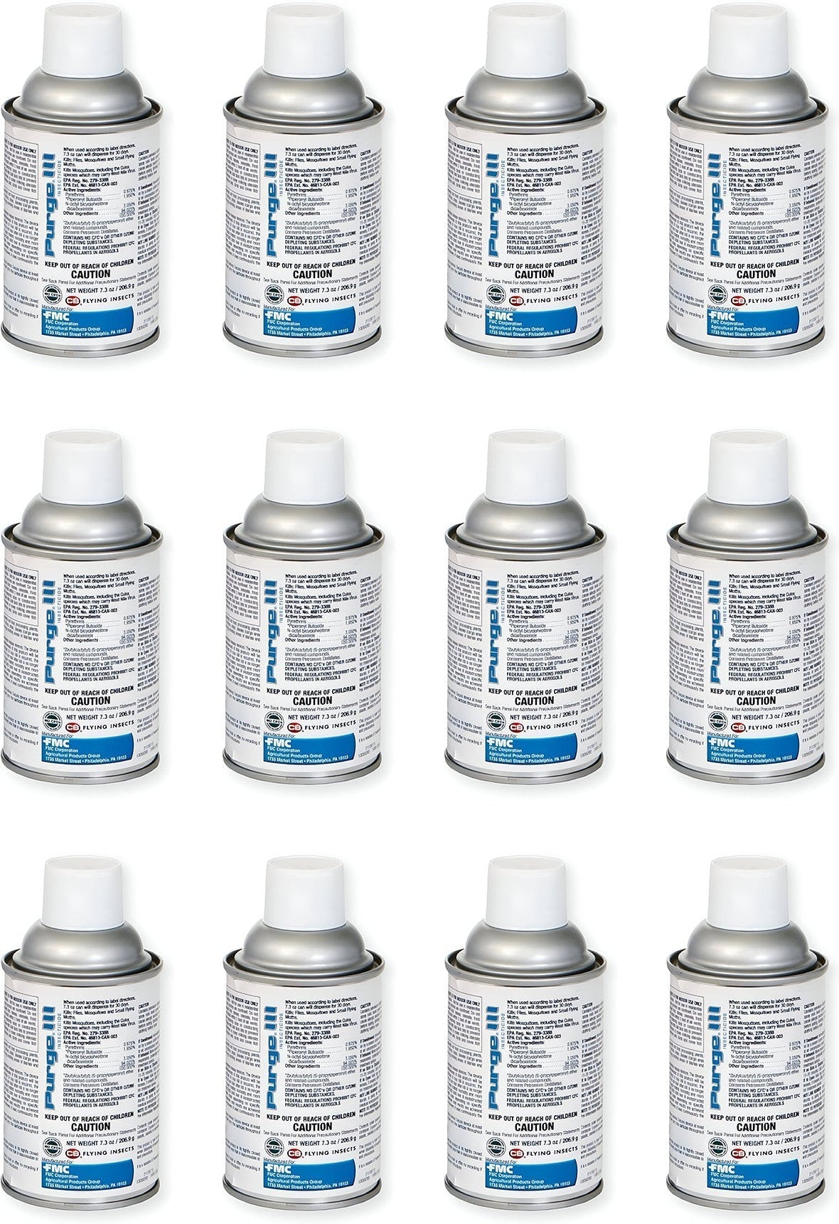 Tackle annoying flying pests in food-handling areas and maintain maximum control 24 hours a day for up to 30 days with Purge III - S Flying Insect Control. This product contains a highly effective pyrethrin-based insecticide specifically labeled for use in automatic pesticide dispensers. The metered valve is activated by the dispenser every 15 minutes, releasing a small amount of insecticide into the air to combat flying insects. Combat flying insects effectively and maintain a pest-free environment with Purge III - S Flying Insect Control. This product offers quick kill, environmental friendliness, compatibility with automatic aerosol dispensers, and long-lasting control, making it an ideal choice for food-handling areas and other spaces where flying pests are a concern.