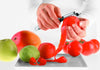 These Rosle kitchen utensils with round handles are filled with epoxy cement which seals the tool so water and germs cannot penetrate. The convenient hanging loop is great for storage. The extra sharp double blade separates even the most delicate skin from fruit. It belongs in the hands of every creative cook. With protective cap for the blade and additional sharpened corer. It is especially suitable for tomatoes, kiwis, pawpaw and mangoes, amongst others.