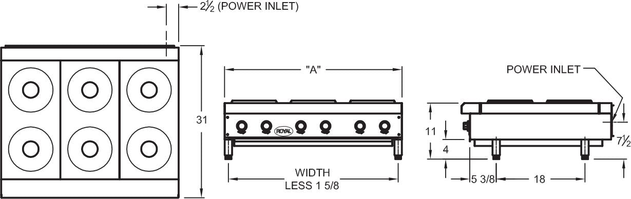 You have control over the hot plate's height with the 4" high adjustable heavy-duty legs, allowing you to customize it to your preferences. Plus, the hot plate comes with a convenient removable stainless steel crumb pan that makes cleanup a simple task. With a variety of power options, including 208V or 240V in both single-phase and three-phase configurations, this Royal hot plate brings versatility and reliability to your kitchen, making it a valuable addition to your professional cooking environment.