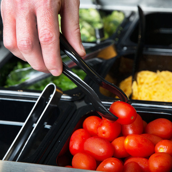The sleek black design of these tongs adds a touch of sophistication to your food presentation, making them a perfect fit for various settings, from casual gatherings to formal events. Their ergonomic shape and non-slip grip ensure ease of use, enhancing your serving experience. These tongs are constructed from high-quality materials, guaranteeing durability and longevity. They are designed to withstand the demands of busy kitchens, catering events, and buffet services while remaining comfortable to handle.