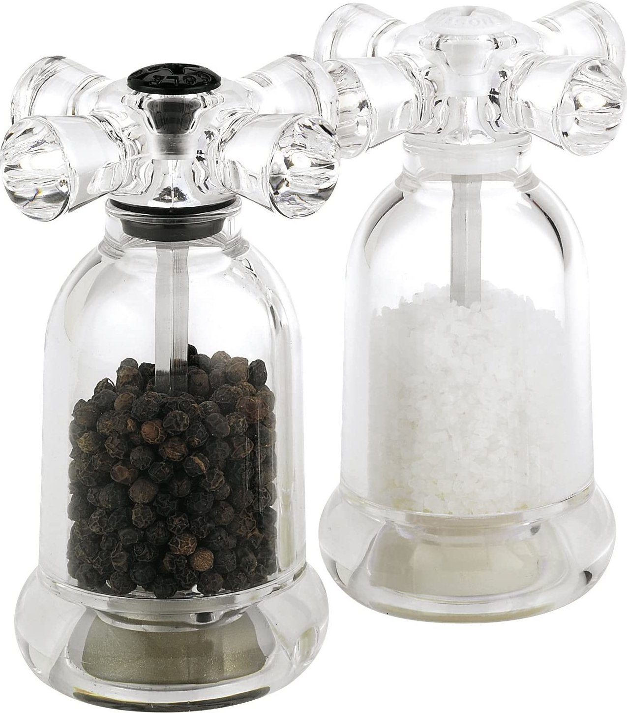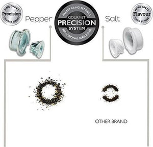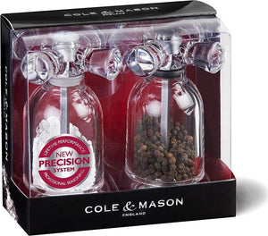 The Cole & Mason Precision System Tap Salt & Pepper Mill Gift Set implements a four-prong fixture design that highlights a unique grip for grinding salt and pepper. Comprised of a sturdy acrylic from top to bottom, these mills come ready to serve. Both mills offer superior grinding via a newly designed precision system. Tap Salt Mills feature a diamond cut ceramic precision mechanism that will smoothly produce perfect size grains every time. Tap Pepper Mills implement a hardened carbon steel precision mechanism that does not crush peppercorns, but strips them to release the maximum amount of flavour with each turn. Turn the top knob to set your favourite grind; unscrew the same knob to pull the top open for refills.