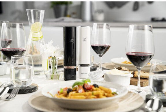 Zwilling - Enfinigy 2 Pc Salt & Pepper Mill Set in classic black and elegant white, a dynamic duo that combines style and function to elevate your dining experience. These compact mills are more than just kitchen tools; they are a testament to the perfect blend of German engineering and innovative design.