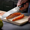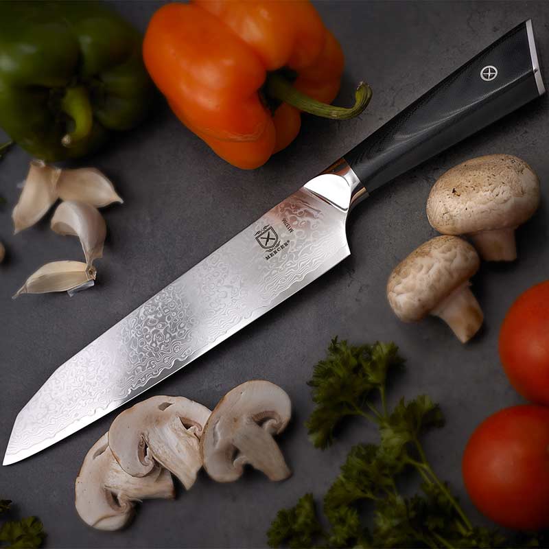 The Mercer Damascus Style 7" Santoku Knife with Black G10 Handle, a culinary masterpiece designed to elevate your cooking experience to new heights. Crafted from razor-sharp super steel with an impressive HRC of 62, this Santoku knife ensures unparalleled precision and efficiency in every cut. Equipped with a premium ergonomic G10 handle, this knife guarantees durability and stability, even in the most demanding kitchen environments. Its moisture and heat-resistant properties make it a reliable companion for all your culinary endeavors. The full tang construction, running the entire length of the handle, provides superior balance, allowing for effortless handling and precise control. Featuring a rounded spine, this Santoku knife offers unmatched comfort during extended periods of use, ensuring a seamless culinary experience with every slice. Discover the perfect blend of performance, durability, and comfort with the Mercer Damascus Style 7" Santoku Knife with Black G10 Handle—a must-have tool for any discerning chef or cooking enthusiast.
