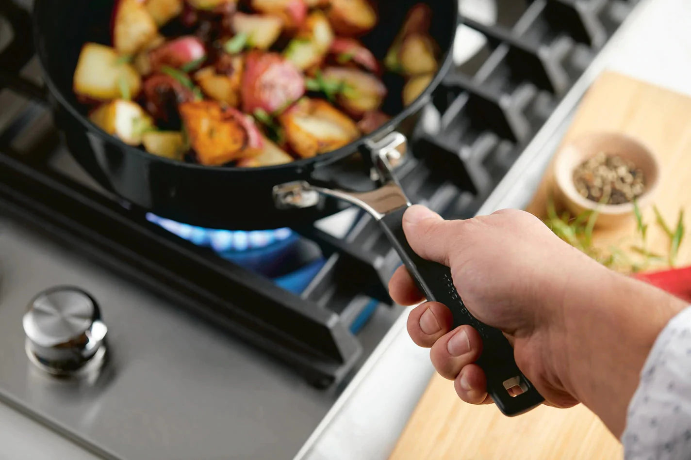 Constructed from hard anodized aluminum, this pan is six times harder than traditional aluminum, making it highly durable for everyday cooking. The hard anodized aluminum material is known for its exceptional strength and longevity, making this saute pan a reliable companion in the kitchen. The interior of the pan, as well as the handle rivets, are finished with a triple-layer nonstick coating. This innovative feature guarantees effortless food release and easy cleaning. Even when preparing rich cassoulets or indulgent braises, you can rely on this saute pan to release your culinary creations flawlessly, while maintaining its pristine appearance.