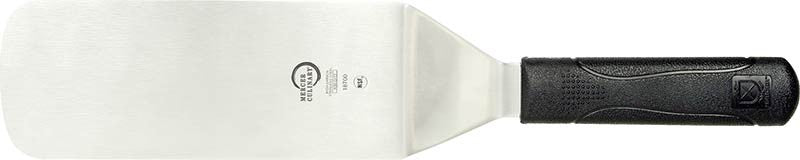 The Mercer 4" x 4.5" Japanese Steel Black Grill Scraper, a must-have tool for any grilling enthusiast. Crafted with precision-ground stainless steel, its blade offers the ideal blend of flexibility and stiffness, ensuring effortless scraping and cleaning of your grill surface. Designed for comfort and control, the scraper features a molded polypropylene handle with a dual-textured finish. This innovative design provides enhanced grip and slip resistance, allowing you to tackle even the toughest grime with ease. Concerned about hygiene? Fear not. The Mercer Grill Scraper boasts a sanitary sealed handle design, ensuring that cleanliness is always maintained. With an overall length of 9 1/4", this scraper is perfectly sized for convenient handling while offering ample reach for thorough cleaning.