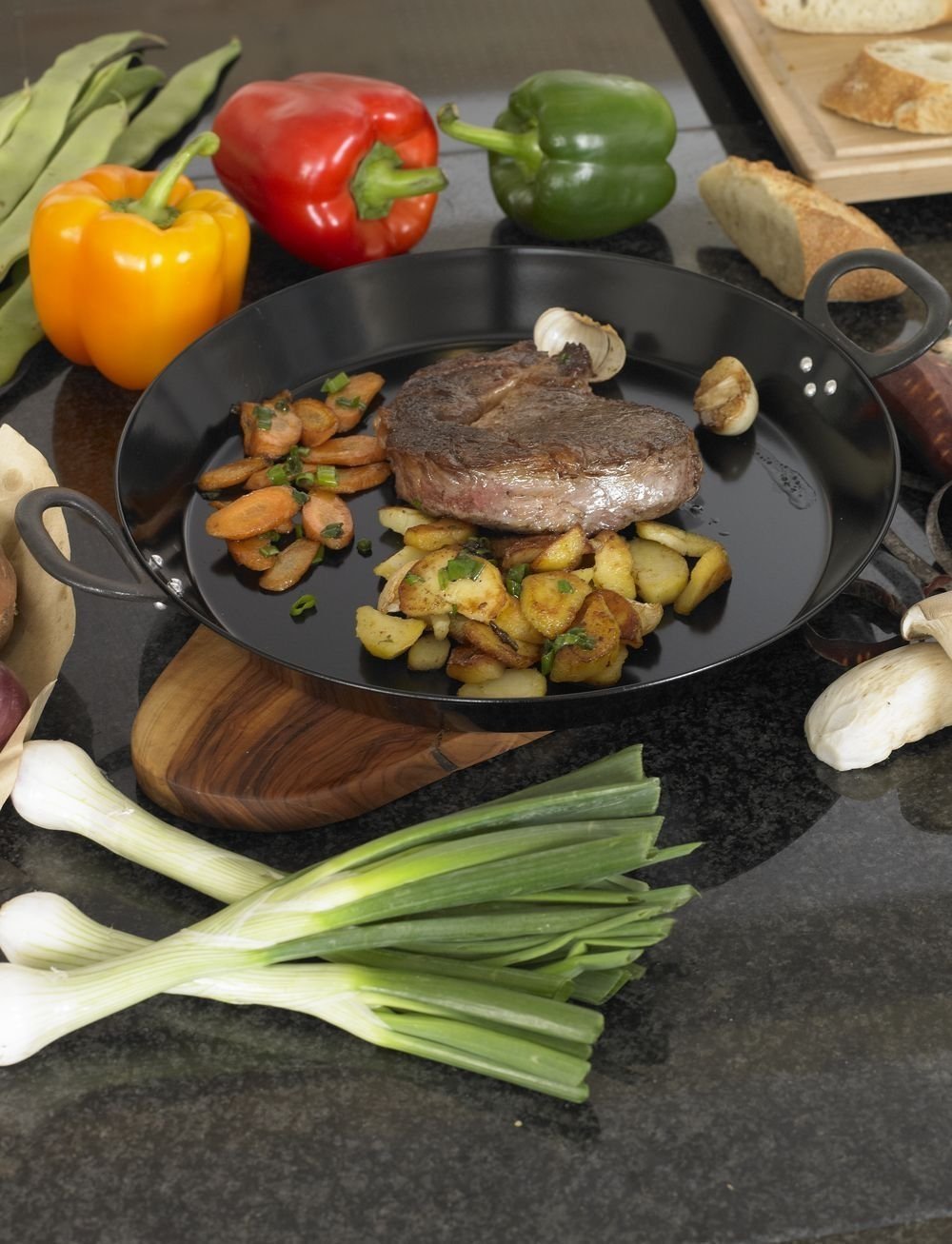 The pan body is made from 2 mm thick iron and the two solid handles are made from cast iron which give the pan its unmistakable character, unique results and durability. Ideal for pan-fried potatoes and flash-fried meat. Can be used on induction cook-tops. As a rule, iron frying pans should not be placed in the dishwasher.