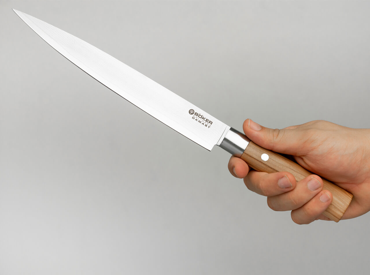 The secret of this unusual sharpness lies in the material and its processing. The blade consists of 37 layers of Damascus steel. The stainless premium blade steel VG-10 used for the center layer is made in Japan and offers hardness, resilience and a homogeneous crystalline structure. In direct cooking performance comparison with a product made by an established Solingen kitchen knife manufacturer in accordance with DIN EN ISO 8442-5, the kitchen knife line Boker Damascus Olive is literally a cut above. The representative DIN test showed that the cutting performance of our knives was 68% better than that of the competitor's product. The knives also score points with their higher level of initial sharpness. Thus, constant sharpening is a thing of the past.