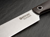 Our Boker Saga chef's knife series - handcrafted by our manufactory in Solingen - raises the bar and brings the topic of "cutting in the kitchen" to a new level. Our decades of experience in the outdoor knife world coupled with the ingenuity and creativity of Danish knifemaker Jesper Voxnaes were incorporated into the concept and design of Saga in an effort to achieve a new level of performance in terms of ergonomics and cutting technology. The carefully orchestrated transfer of this joint know-how into the culinary field is proof that working with Boker Saga will be an entirely unique experience. The softly swung grips are fabricated from exclusive certified imported grenadilla wood. With its high hardness and density, grenadilla wood is a fixture in the European wood instrument making field. The successful ergonomics already become apparent when the Boker Sage knife series is first handled: every curve, every bend in the line nestles itself into place on the hand, conveying absolute control and an exceptional cutting experience. The swallow-tail-shaped flare of the pommel on the larger models enhances grip security.