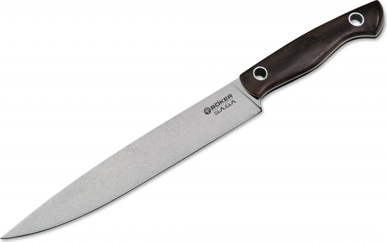 Boker Saga owes its high strength to the full-tang design, which extends over the full length of the knife (in the same manner as on many hunting knives) from the blade tip to the pommel. The optimized cutting performance is not only guaranteed by the full flat grind of the blade with stonewash finish, but also by selecting 440C as the blade steel, which far surpasses the edge-holding and corrosion-resistance of conventional chef's knife steels. This surface finish is achieved in a specialized grinding process and is characterized by outstanding gliding properties through the cutting material, thus enhancing the already superior cutting performance. In addition, the micro-structure of the stonewash finish is extremely scratch-resistant, since these are typically visually absorbed by the texture. A special note is achieved by the large hollow rivets, the unmistakable mark of Jesper Voxnaes. Thanks to its long and slim shape, the Carving Knife is ideally suited for the precise cutting of meat and fish. Extremely fine slices can be cut just as easily as cubes or uniformly strong tranches. The Carving Knife is slightly more flexible than other knives and slides optimally through the meat.