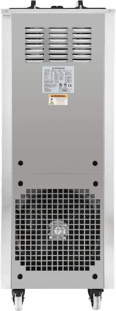 - Dual Compressors : This air-cooled unit comes with (2) 3.2 liter freezing cylinders, (2) 6500 BTU/HR main compressors (use R-404A refrigerant), and a separate 480 BTU/HR cooling compressor (uses R-134a refrigerant). It has (2) 1 hp motors.
