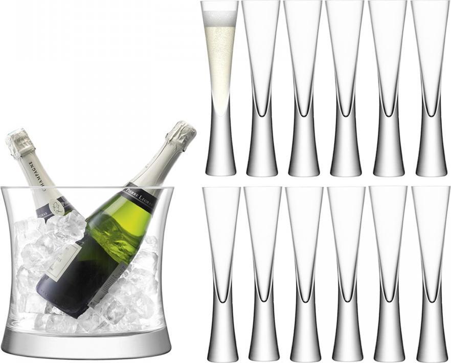 A luxurious champagne serving set that is suitable for 12. Featuring Moya's characteristically thick base and weighty stem, the hand-made champagne flutes and dual champagne bucket are ideal for grand celebrations or as a special gift.