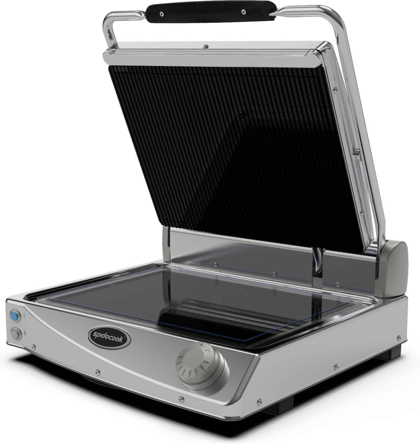 The Spidocook Black Medium Ribbed Manual Panini Grill is a top-quality kitchen appliance designed to deliver perfectly grilled sandwiches, paninis, and other mouthwatering dishes with efficiency and ease. Ideal for commercial kitchens, cafés, delis, or home kitchens, this panini grill offers high-quality performance and a sleek, modern design that complements any kitchen setting. Optimize space in your kitchen with a compact design that fits in any setting.