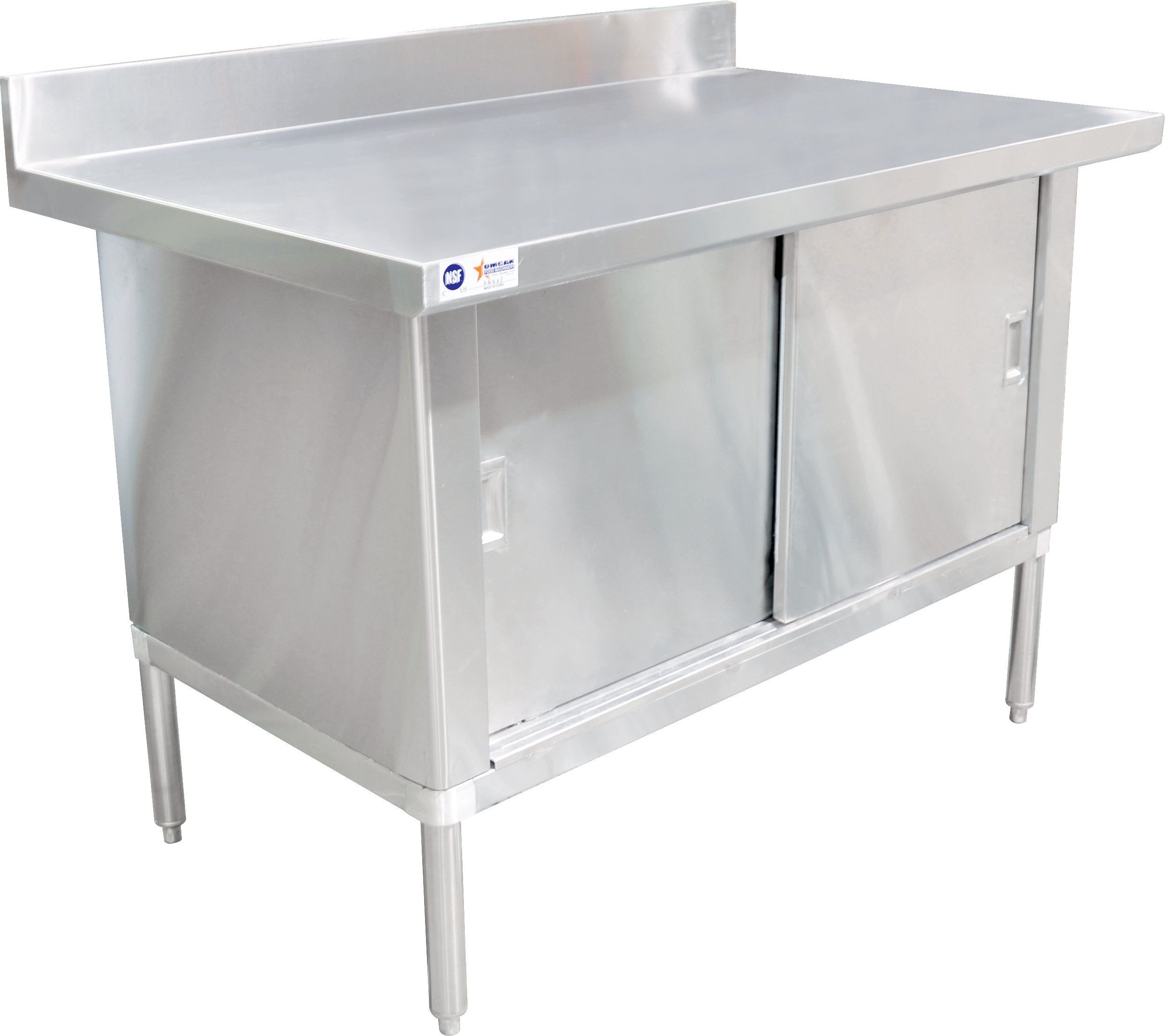 Work efficiently with this knock-down worktable with cabinet, 4" backsplash and 3" overhangs. Ideal for any commercial kitchen to help food preparation in a busy, fast-paced setting. Featuring 430 stainless steel, this worktable has an enclosed cabinet with sliding doors and recessed handles to easily store kitchen equipment and other products in need.