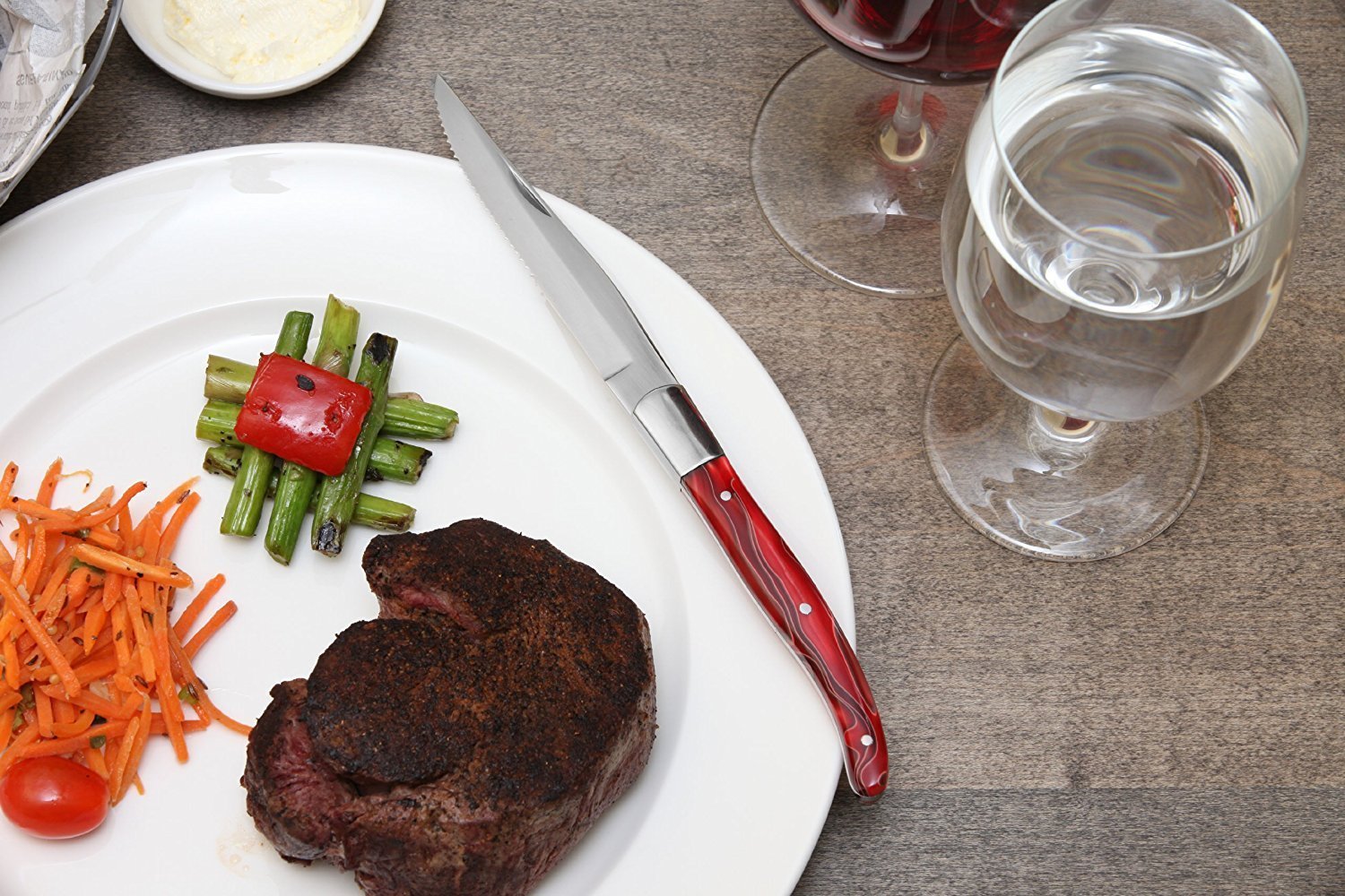 Complete your flatware collection with matching or contrasting steak knives. Fortessa steak knives are found in the upper end steak and chop houses throughout America. Restaurant durability and elegantly designed, this style compliments your table at an everyday price. Fortessa steak knives are high-quality and are made of fine 18/0 stainless steel. If you are a beef eater, you will love having the Fortessa restaurant-quality steak knife. Set includes: 4 serrated steak knives with red handles.