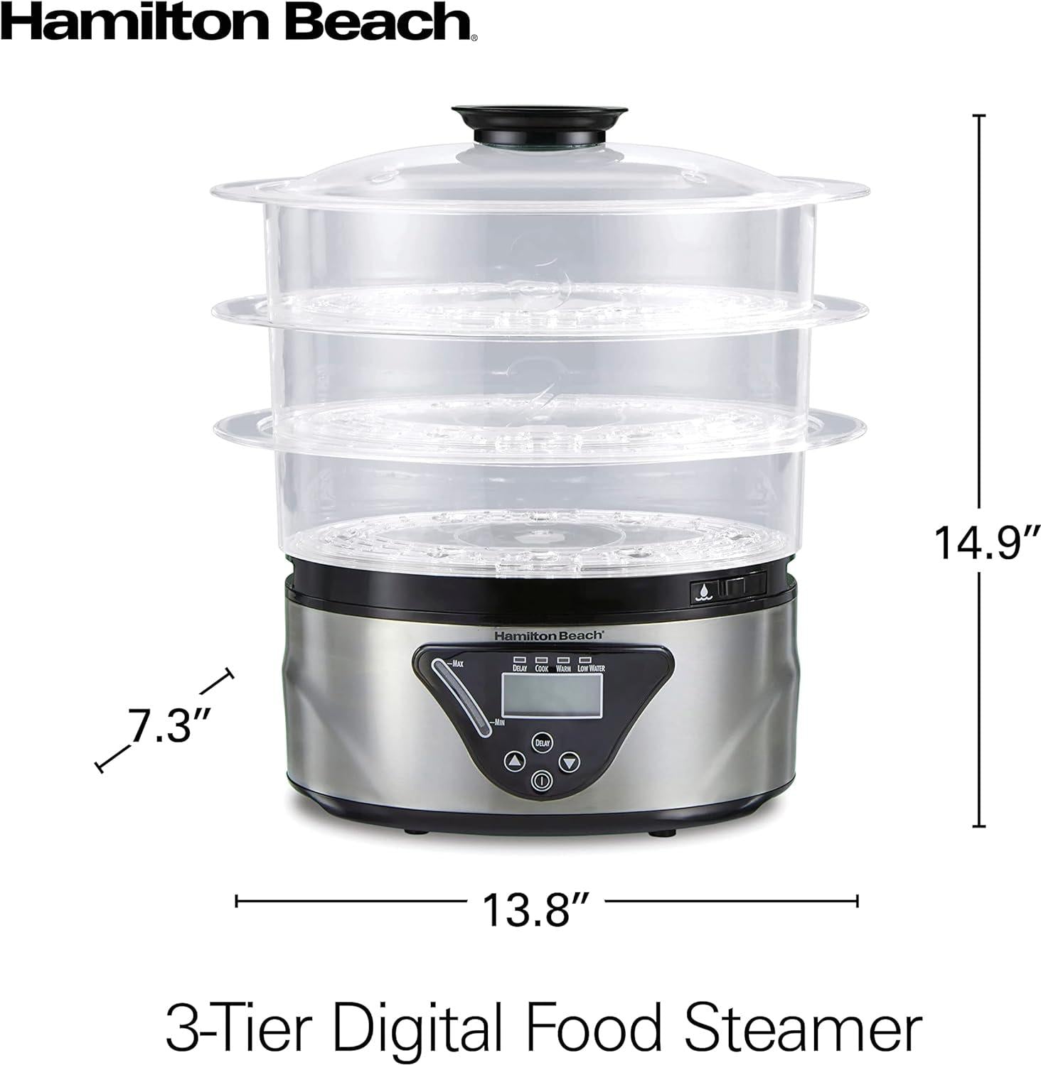 The Hamilton Beach 3-Tier Digital Electric Food Steamer (Model 37545) is designed to simplify healthy cooking by allowing you to steam a variety of foods simultaneously. Its stackable design and digital controls make it a versatile addition to any kitchen.