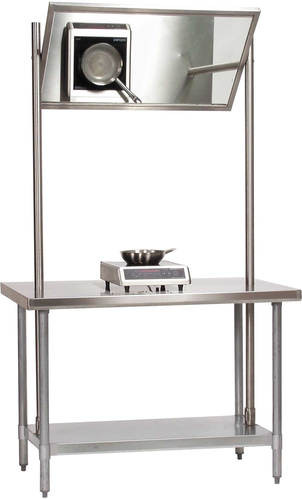 Demo Table, open base, 48"W x 30"D x 94"H, overhead mirror, stainless steel top, galvanized undershelf & legs, NSF. Actual item may differ from image.