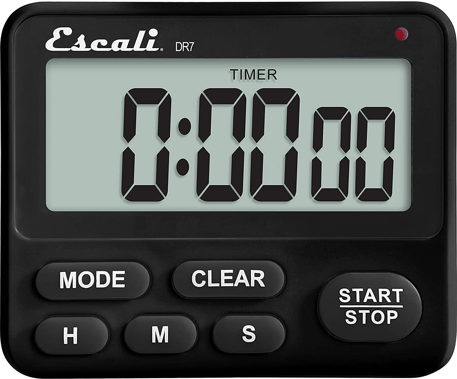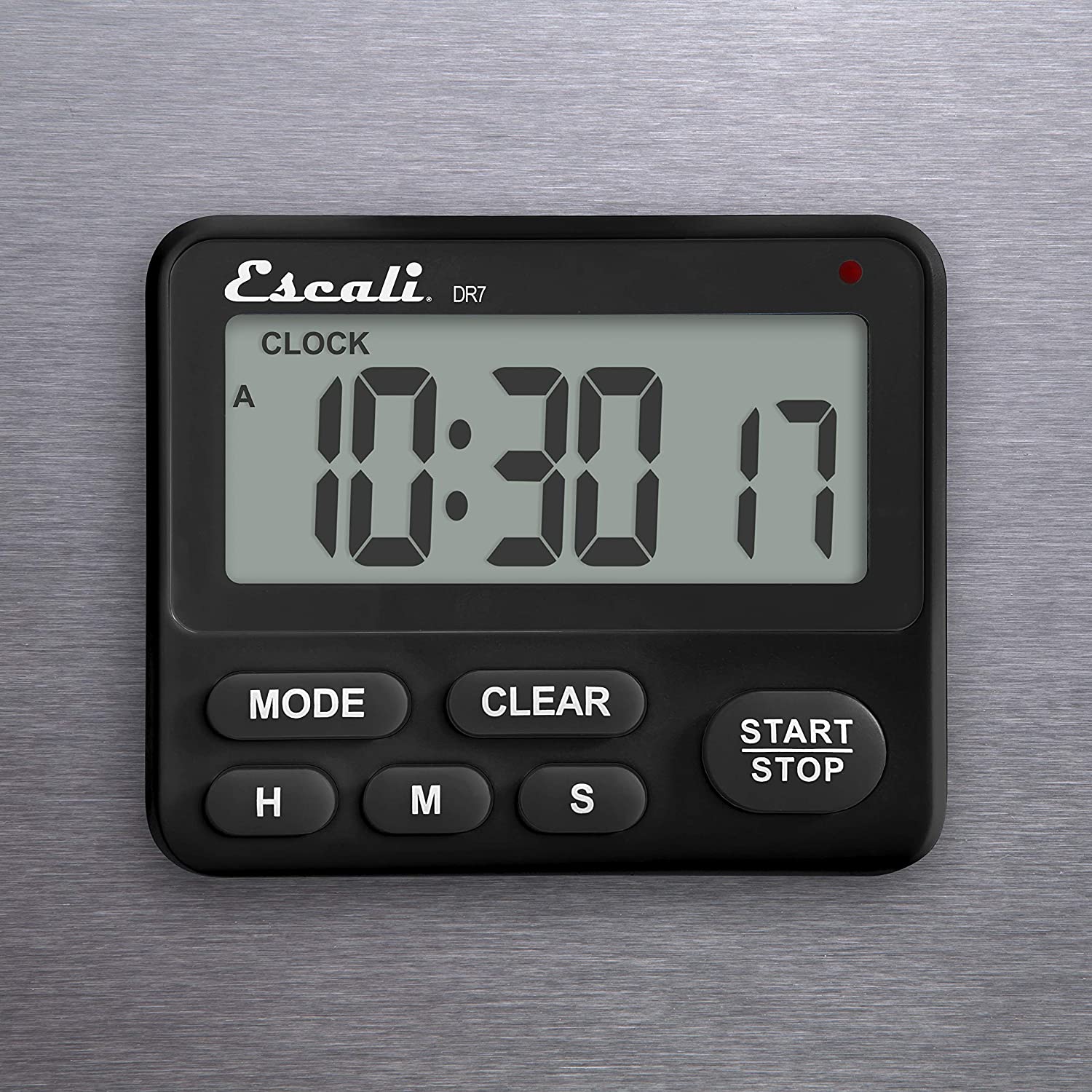 The Escali DR7 Extra Loud Digital Timer will help you keep track of events in loud environments and features a silent mode with a visual alarm for use in quiet situations. The timer can count up or down to a maximum of 99 hours, 59 minutes and 59 seconds and the overtime counter will help you keep track of how long the timer has expired  The 110 decibel alarm and flashing light will easily alert you when a timer has expired. Switch the extra-loud alarm to mute and use the flashing light to alert you to an expired timer. The timer counts up after an alarm has expired until you press the ‘Start/Stop’ button. Count up or down to a maximum of 99 hours: 59 minutes: 59 seconds. Recall the last timer setting automatically at the touch of a button when performing repetitive tasks. Keep track of the time with 12 and 24-hour clock modes. Use the magnetic back to hang the display on a nearby refrigerator, place it on a countertop using the built-in kickstand, or hang it from the wall with the retractable tab.