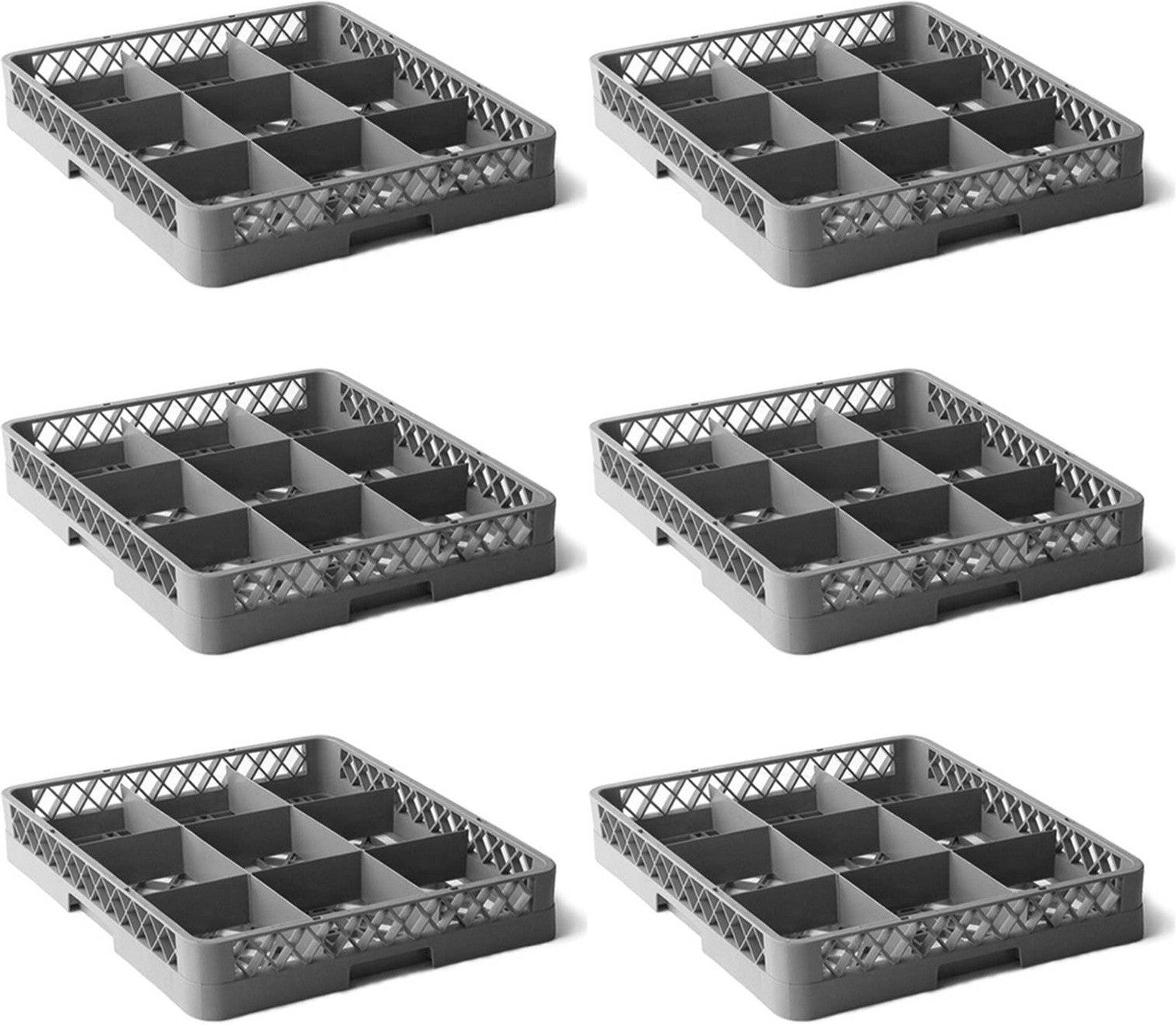The 16-compartment design of the rack optimizes space utilization and dish organization. This innovative design feature allows for the segregation and secure placement of a variety of dishware, including plates, bowls, cups, and utensils, ensuring they are held securely in place during washing and transport. The rack's grey color provides a neutral and clean appearance suitable for different kitchen settings. Its simple yet effective design seamlessly integrates into various dishwashing environments, maintaining an organized and hygienic workspace.