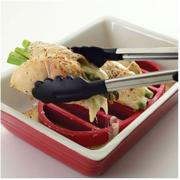 Stainless steel frame with non-slip silicone head and grips. Compatible with all nonstick cookware. Silicone heads are heat resistant to 410°F/210°C. Push down on hang hole to open and pull up on hang hole to close. Hang them with the hanging loop after use for space saving. Dishwasher safe.