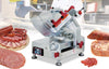 This belt-driven gravity automatic slicer is equipped with two separated fan-cooled motors: one operating the blade, the other one operating the carriage. It is designed with anodized aluminum alloy, red plastic parts, knobs and feet, tempered chromium steel blade. Thanks to slicer's adjustable carriage stroke, this unit meets any requirement and allows professionals to slice in less time.