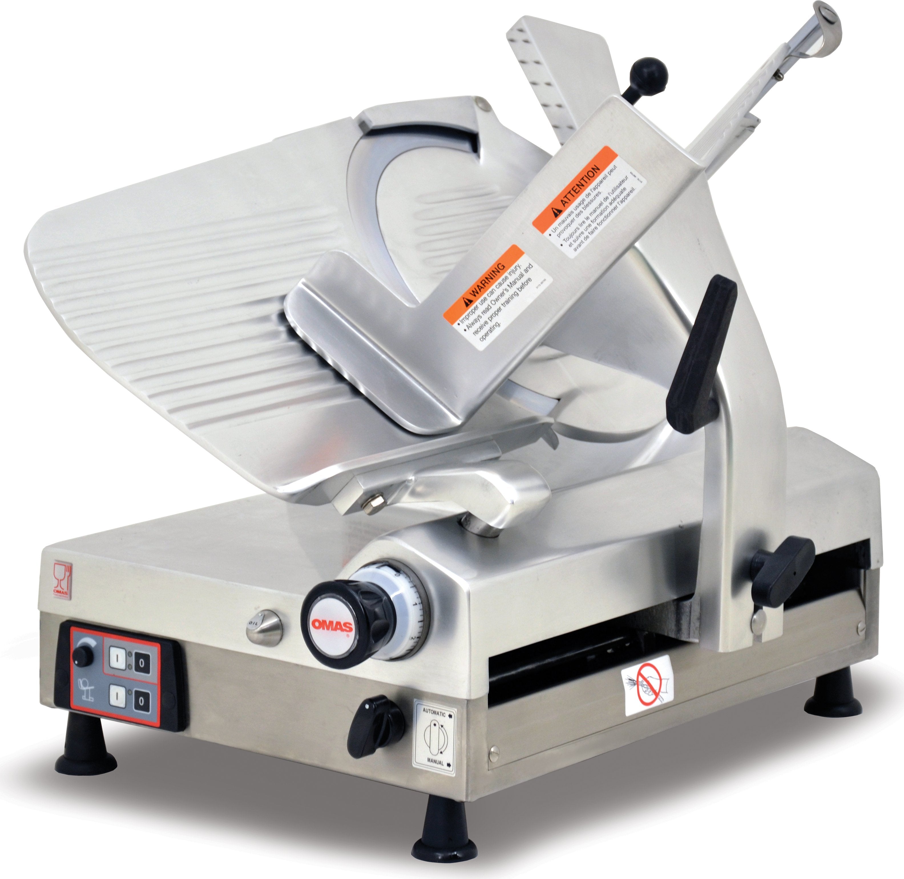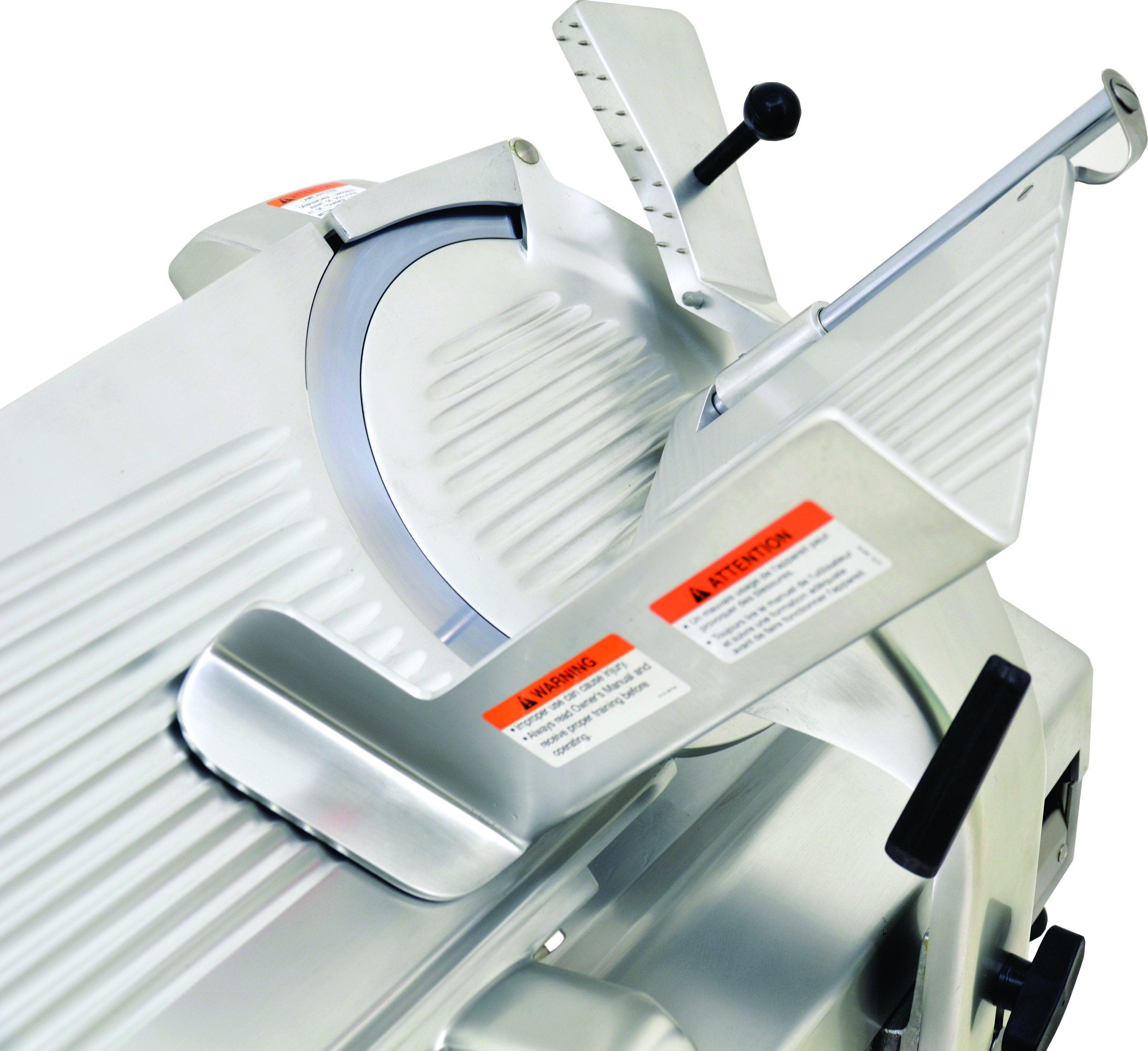 This 13" blade gear-driven automatic slicer provides long-lasting heavy-duty performance and dependability. Its polished anodized aluminum body along with its high-carbon, hard-chromed blade provides long life and durability. This unit comes equipped with safety features. Polished anodized aluminum body along with its high carbon, hard chromed blade provides long life and durability.