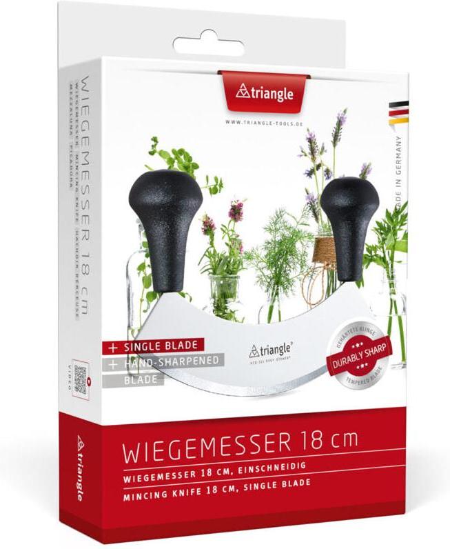 The Triangle 7" Single Blade Mincing Knife is a precise, handcrafted tool ideal for effortlessly chopping herbs, garlic, onions, chilies, nuts, and more. Its gently curved stainless steel blade delivers smooth rocking motions, allowing full control over the texture—whether coarse or fine. Designed with two ergonomic wooden handles, it ensures excellent stability and strength transfer during use. Made in Solingen, Germany, each knife is hand-sharpened for exceptional cutting performance and long-lasting sharpness. Perfect for compact kitchens, this single-blade version is easy to clean and extremely versatile.