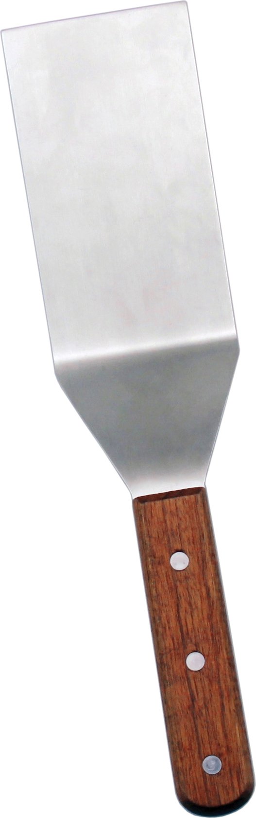 This turner is made of satin stainless steel with a wood handle. Our kitchen turners are perfect for preparing meat and vegetables on the grill. The square-end blade on this turner is highly durable and exceptional at "holding an edge".