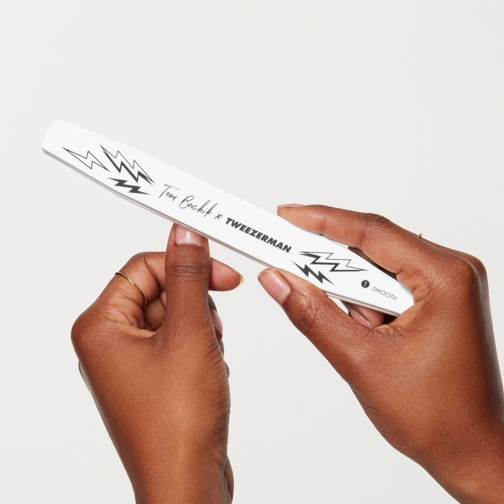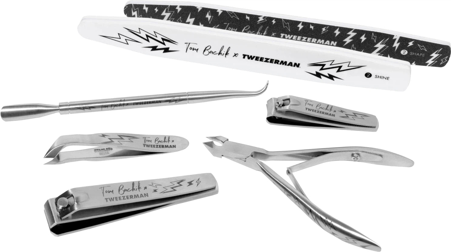 Curated by celebrity manicurist Tom Bachik, this limited edition Tweezerman Tom Bachik Manicure Kit is a comprehensive set of 7 essential nail care tools. Inspired by Tom’s skateboarding background and an edgy take on the 1980’s Tweezerman lightning bolt logo, this set features a hand-sketched design in honor of the 40th birthday of the Classic Slant Tweezer. Each professional-quality tool is made from stainless steel and hand-crafted for ultimate precision. Plus, receive a FREE travel bag with any Tom Box purchase. Ensure your nails are always impeccably groomed with the Tweezerman Tom Bachik Manicure Kit, a perfect blend of style and functionality for at-home and on-the-go nail care.