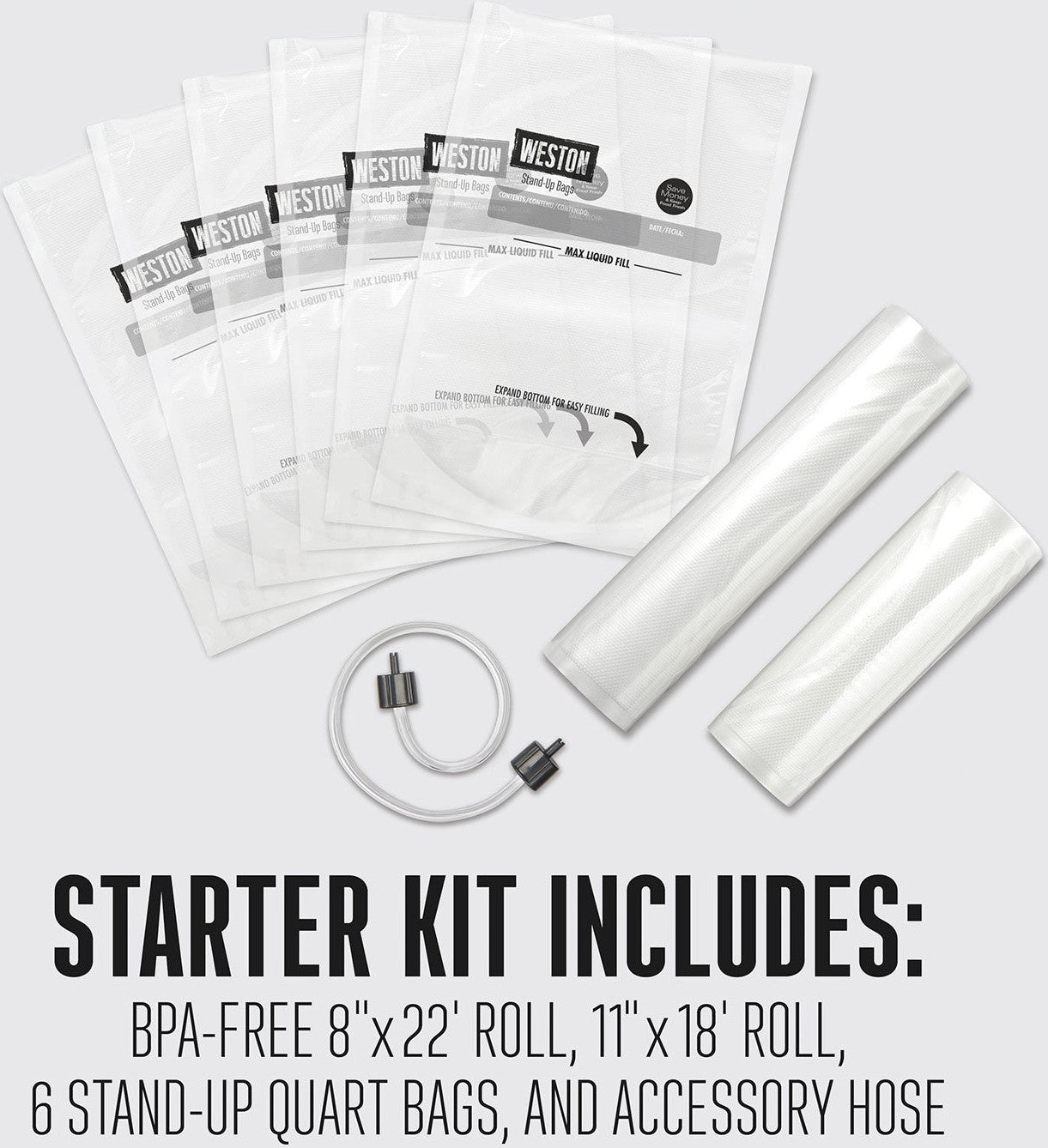 Kit has everything you need to get started. Includes 8 x 22 ft BPA-free roll, 11 x 18 ft roll, 6 Weston quart bags, and an accessory hose. Safe for freezer, refrigerator, and sous vide cooking.