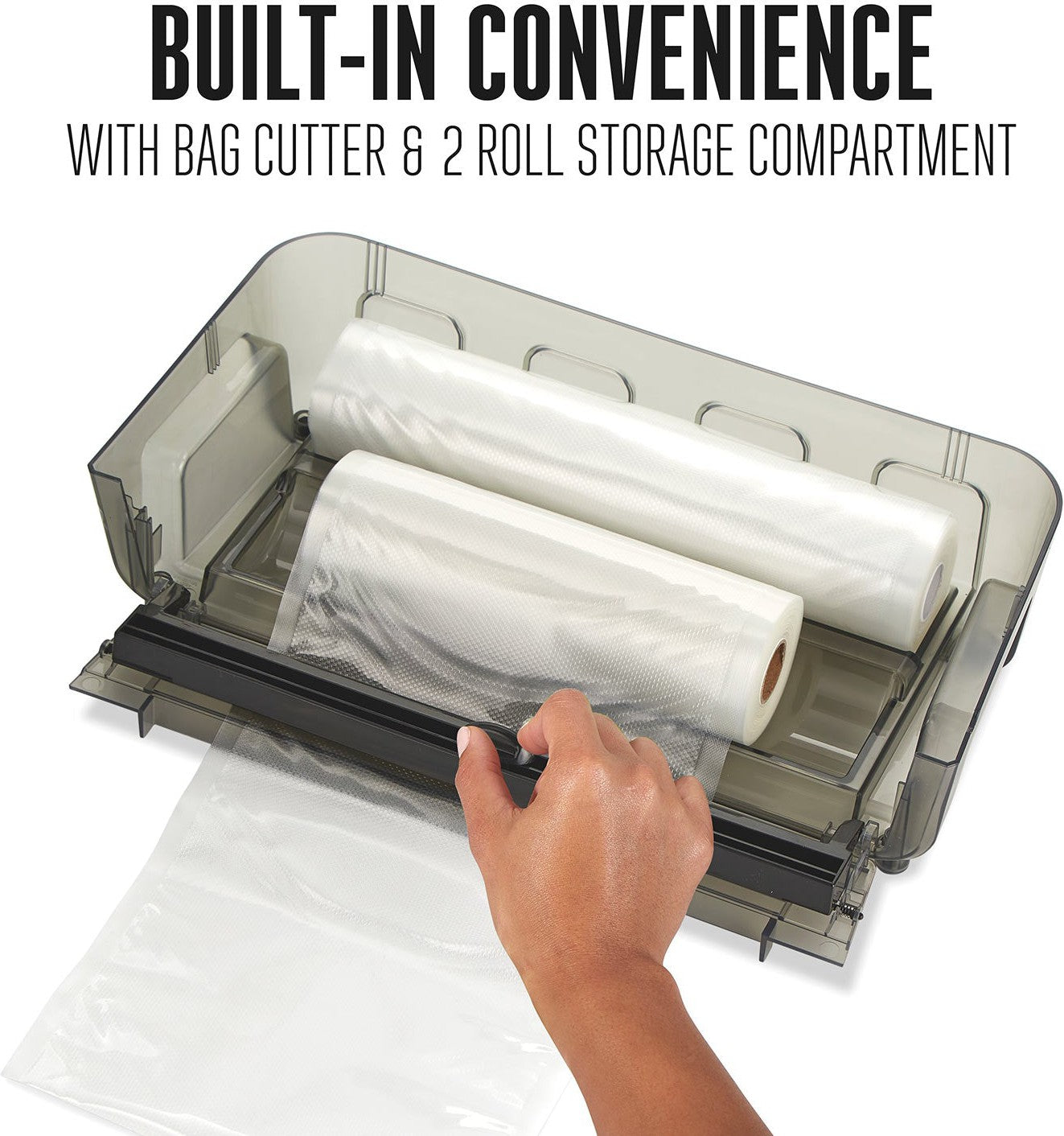 The built-in storage compartment neatly stores 2 different sizes of rolls, ensuring you always have the right size of vacuum sealer bags for the job. Cut bags to size quickly with the built-in cutter.
