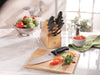 Serve up a feast with the Swiss Classic 10-Piece Cutlery Block Set. The razor sharp stainless steel Chef, Boning and Carving blades are ideal for slicing, chopping and carving, while the Paring blades allow for easy peeling and cleaning. High carbon stainless-steel blade provides maximum sharpness and edge retention. All knives are made from first class stainless steel and are lifetime guaranteed against any defects in material and workmanship. Set includes: 3.25" Straight Paring Knife, 3.25" Serrated Paring Knife, 4.5" Serrated Utility Knife, 6" Utility Knife, 6" Boning Knife, 8" Chef's Knife, 8" Bread Knife, 9" Sharpening Steel, Shears and Hardwood Block.