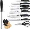 Specially designed with the home chef in mind, our Swiss Classic 15-Piece Block Set includes all the knives and tools you would need to create an exquisite culinary dish at home any day of the week. Swiss Made. Lifetime Warranty. Set includes: 3.25" Paring (Straight), 4.5" Utility (Serrated), six 4.5" Steak (Sear Tip Serrated), 5’’ Utility/Chef’s, 7’’ Granton Blade Santoku, 8’’ Chef’s, 8.25’’ Bread (Serrated), 10’’ Honing Steel, Come-apart Kitchen Shears and a Slant Hardwood Block.