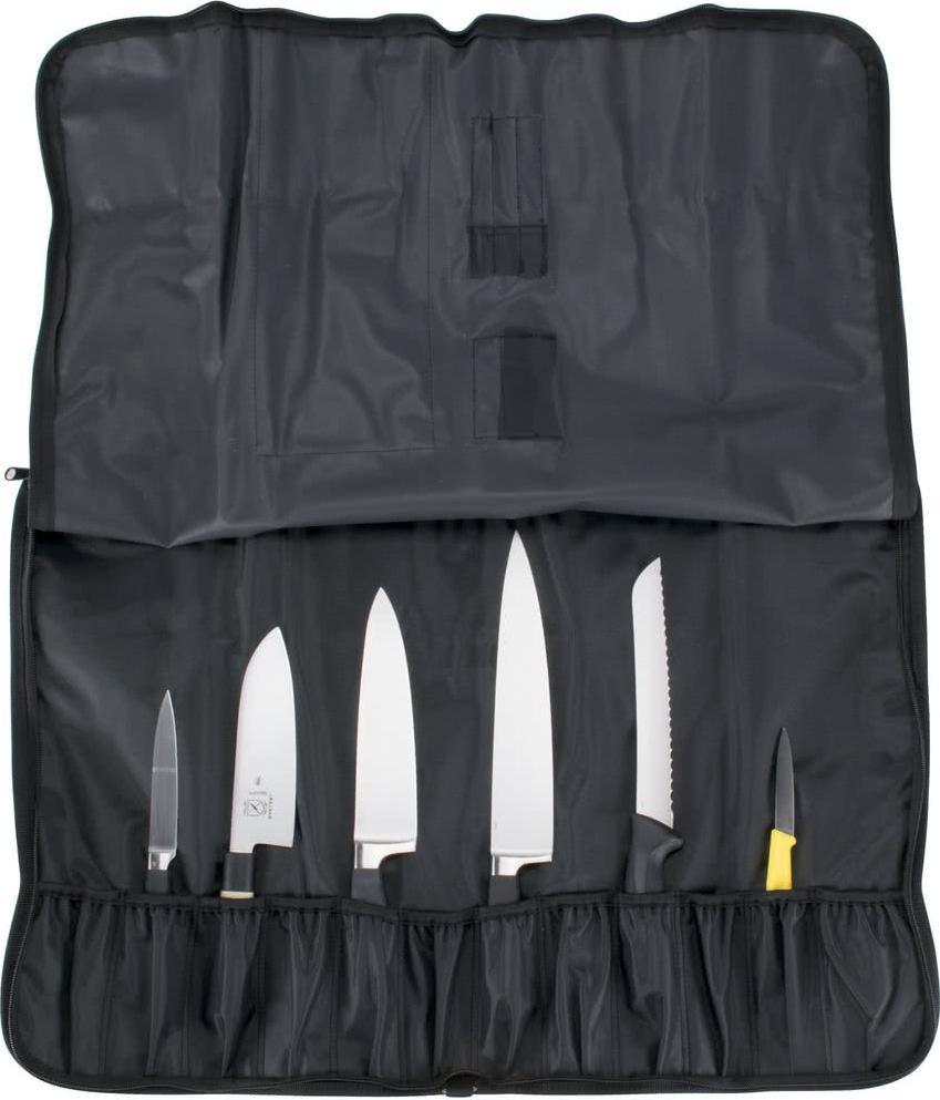 For students and working professionals in need of superior knife storage and transportation, look no further than Victorinox’s polyester tri-fold knife rolls. Made of ultra-durable black polyester with PVC lining for water resistance, this knife roll offers excellent protection for your tools in a soft and comfortable case. This roll is capable of holding 12 knives up to 12” in blade length of any shape or style in extremely sturdy double stitched pockets that are elasticized to hold them securely in place.