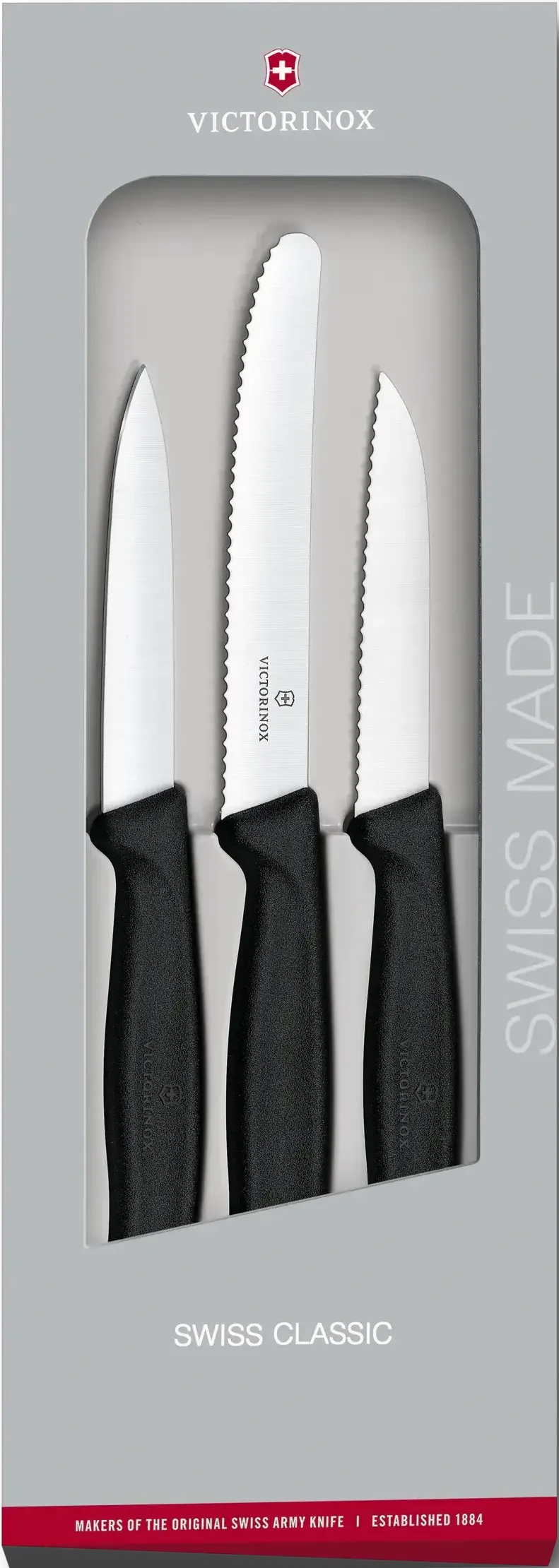 he Victorinox 3-Piece Black Paring Knife Set is an essential addition to any kitchen, offering versatility for slicing, peeling, and coring. Designed in Switzerland, this set includes three specialized knives: a pointed tip paring knife, a straight edge paring knife, and a wavy edge tomato and table knife. Each knife features an ultrasharp blade and an ergonomic polypropylene handle for a comfortable grip. Whether you're preparing fruits, vegetables, or intricate garnishes, these high-quality knives provide precision and efficiency.