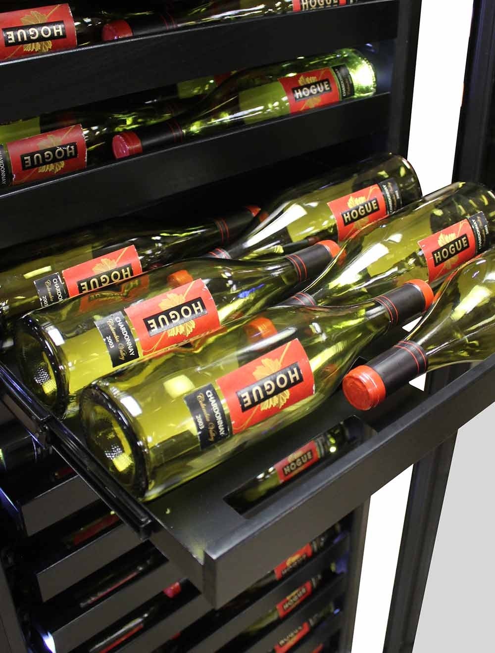 - Equipped with 14 gliding Ouzo™ style wine racks with black wooden lip.