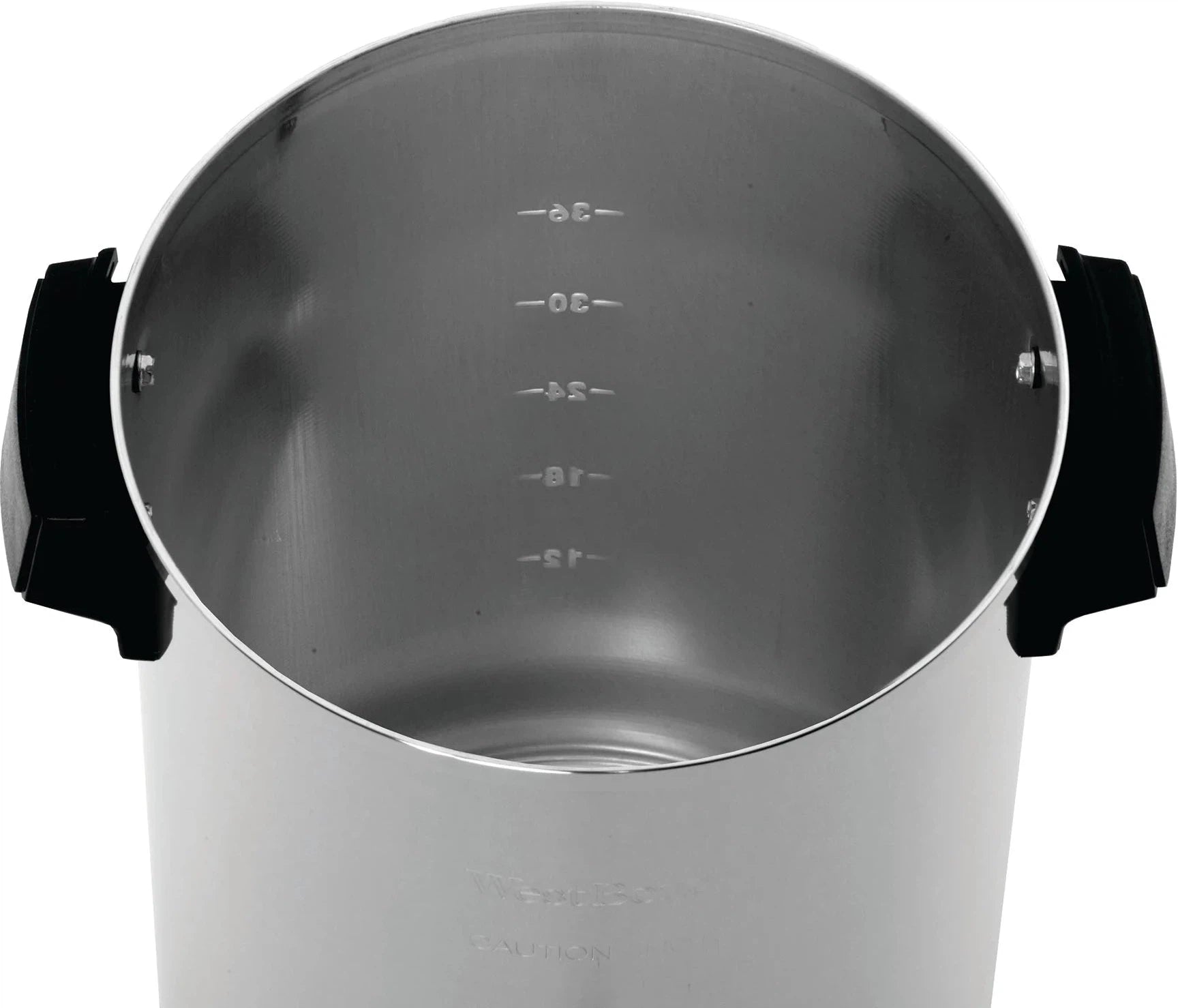 When you need to serve coffee to a lot of people quickly, you'll want a West Bend Automatic Coffee Maker. In just 36 minutes, a convenient serving light will alert you that 36 cups of tasty, hot coffee is ready. And for safety, the twist - to - secure cover minimizes spills in case someone accidentally knocks the coffeemaker over. When you need to serve a lot of coffee, you'll appreciate the West Bend Automatic Coffee Maker.