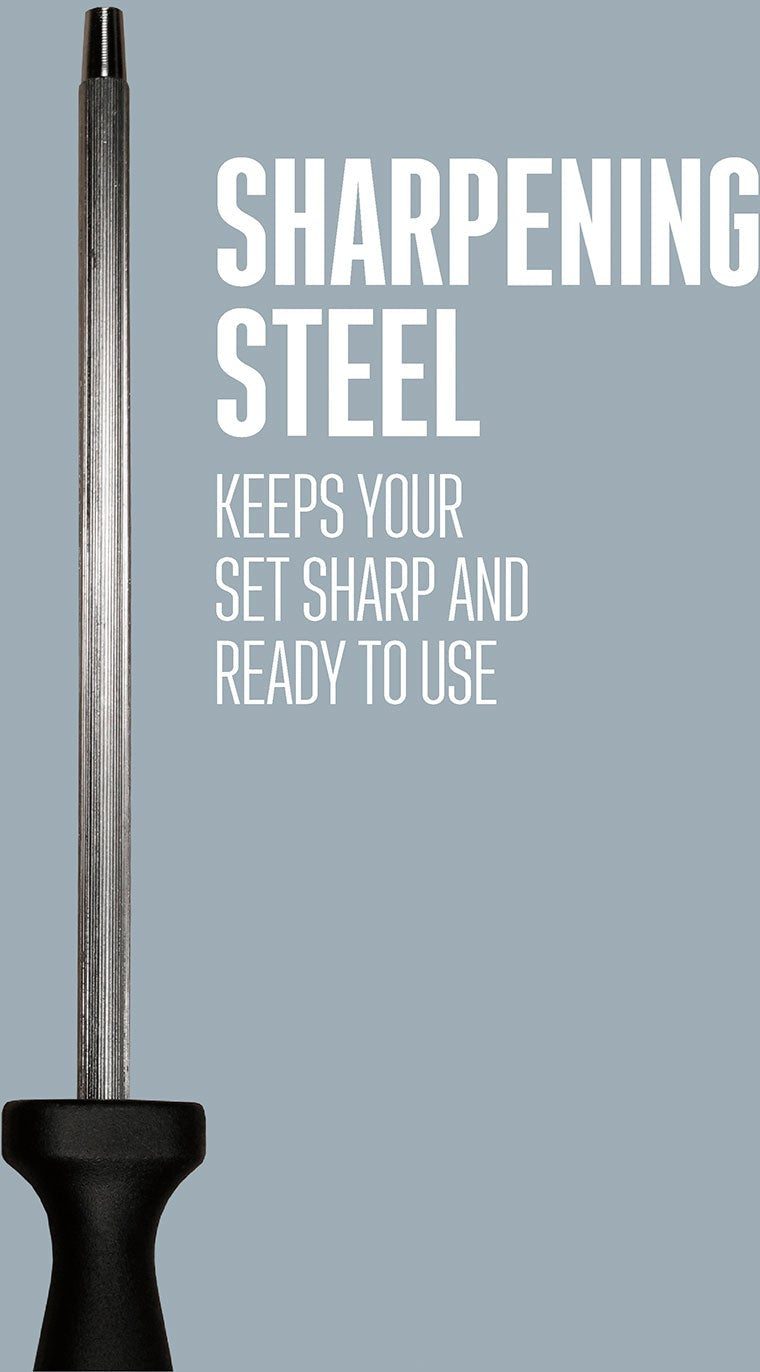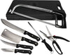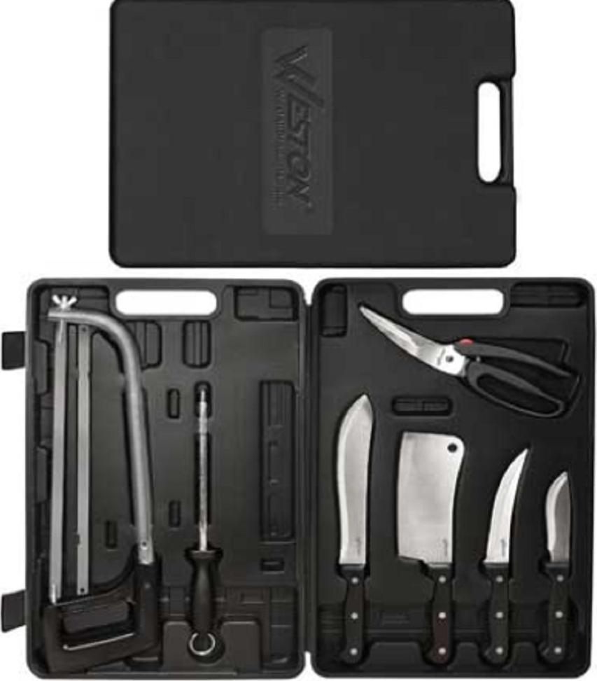 The Weston 10 Piece Game Processing Knife Set has everything you need to process game in the field or at home. It includes an 8" butcher knife, 6" cleaver, 5.3" boning/fillet knife, 4.2" skinning knife, adjustable 12.25" butcher saw with 2 steel blades, sharpening steel, spring-open game shears with safety lock, and storage case. The 3 included knives and cleaver are made of rust-resistant, 420 grade stainless steel with full tang blades for increased balance and leverage. The ergonomic, riveted handles give you more stability and control when processing fish, poultry, rabbits, and other game. The heavy-duty, spring-open game shears have a bone-breaking notch that's great for processing small game and poultry. The shears are made of 420 grade stainless steel and have a safety lock. The complete set fits neatly in the portable, hard-sided storage case with built-in handle so it's easy to carry the set into the field, on fishing trips, or anywhere you need to process game or fish. The included sharpening steel helps keep the knives, cleaver and shears sharp on the go. The butcher saw is adjustable and comes with 2 carbon-steel blades. The set is backed by Weston with a 1 year limited warranty.