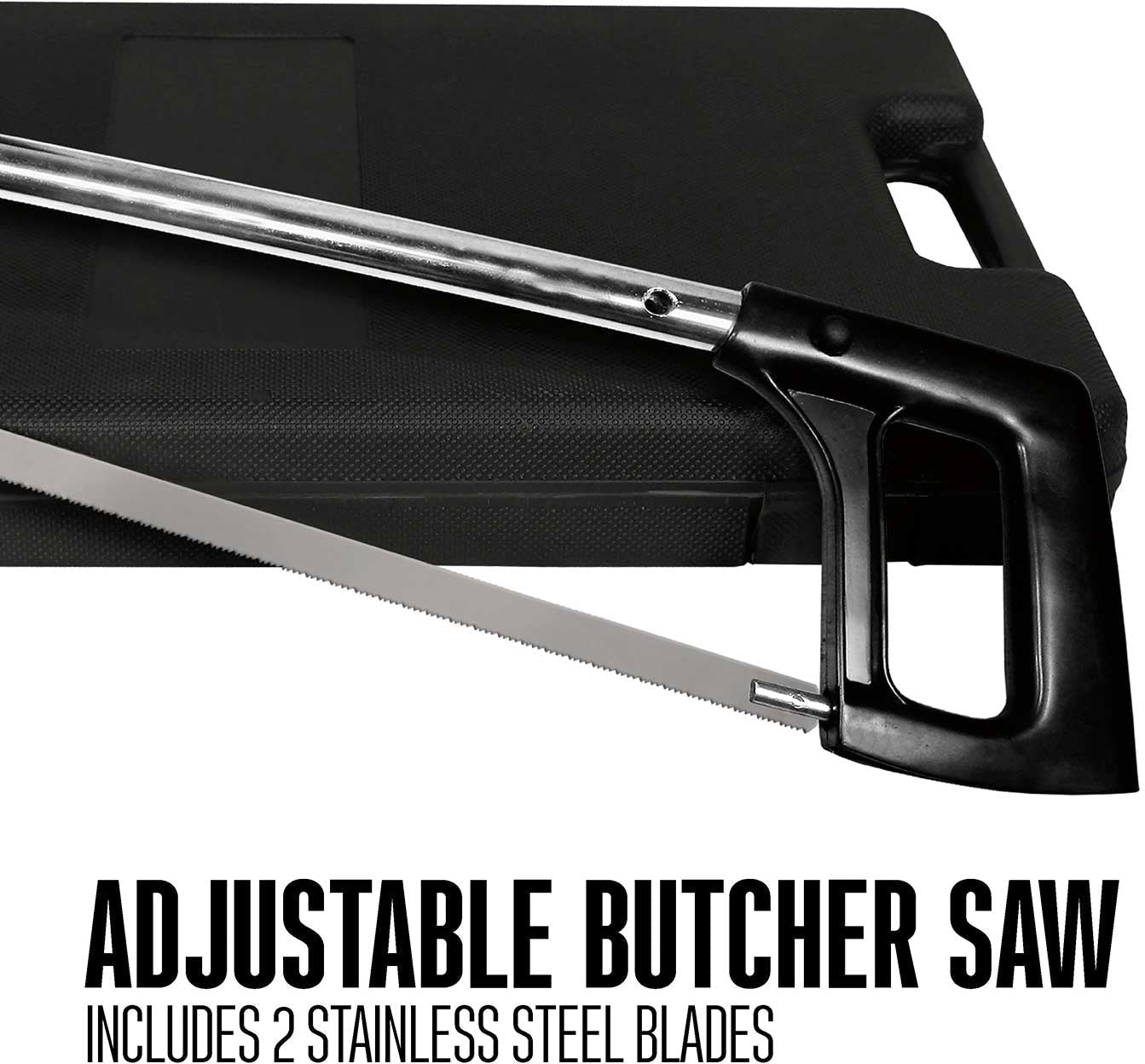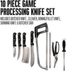 - Complete 10 piece set:- The set comes with everything you need to process game: 8" butcher knife, 6" cleaver, 5.3" boning/fillet knife, 4.2" skinning knife, adjustable 12.25" butcher saw with 2 blades, sharpening steel, game shears, and storage case.
