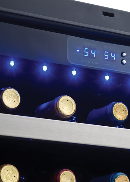 Chill and preserve your favorite wine collection with the Danby Designer 45-Bottle Wine Cooler. Designed for both red and white wines, this 4.3 cu. ft. freestanding unit offers premium cooling performance with a frost-free, fan-forced system and precise digital controls. The sleek stainless steel door and black wood shelves with stainless trim give it a refined appearance, while energy-efficient blue LED lighting creates an elegant display. A reversible door, tinted tempered glass, and programmable thermostat make this cooler a stylish and practical choice for any wine enthusiast.