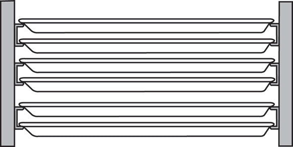 End Load Holds (1) 18” x 26” Full Sheet Pans, Side Load Holds (2) 18” x 14” Half Sheet Pans