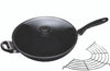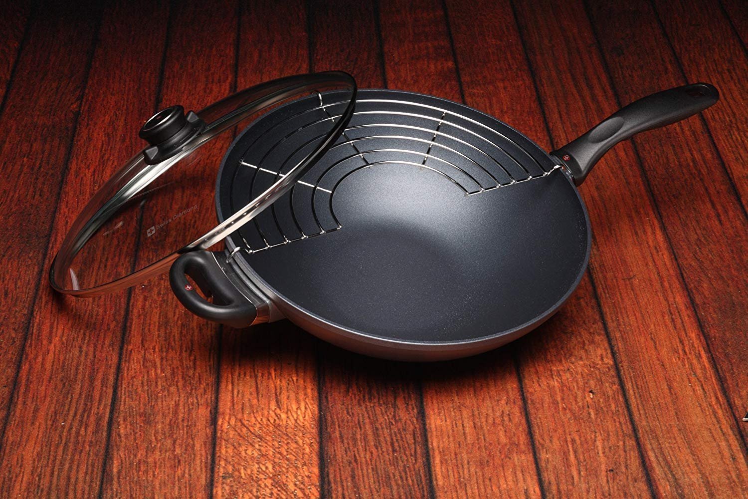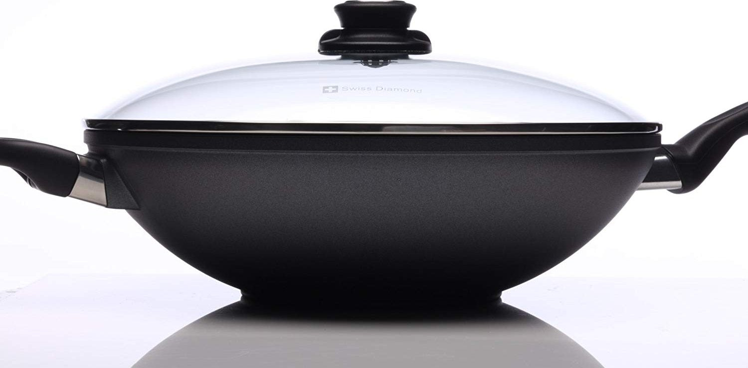 The 32 cm (12.5”) induction nonstick wok is designed for use with little or no oil for a healthier stir-fry, while still encouraging traditional wok cooking methods. No need for a wok ring. Swiss Diamond works have a perfectly flat cast aluminum base. It also includes a lid and a tempura rack, which sits on the rim of the wok to drain deep-fried foods. The included tempered glass lid allows you to monitor food without lifting the cover, maintaining flavor and keeping food from drying out. The rotating lid knob opens or closes a steam vent to release or contain moisture as needed.