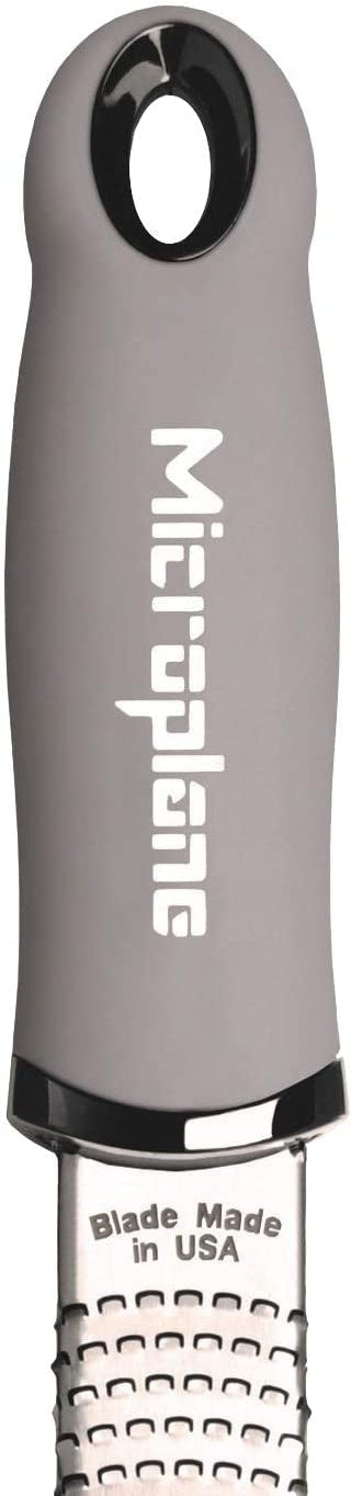 Updated handles for a Classic Zester This version of the classic Microplane zester/Cheese Grater has a premium soft-touch handle and non-scratch end tabs. This tool grates even the hardest Parmesan Reggiano as well as other hard cheeses into fine lacy wisps. Ideal for topping your favourite spaghetti and meatballs or a Caesar salad. It’s also wonderful for effortless citrus zesting to add natural flavours to a lemon crème brulee or a basic vinaigrette.