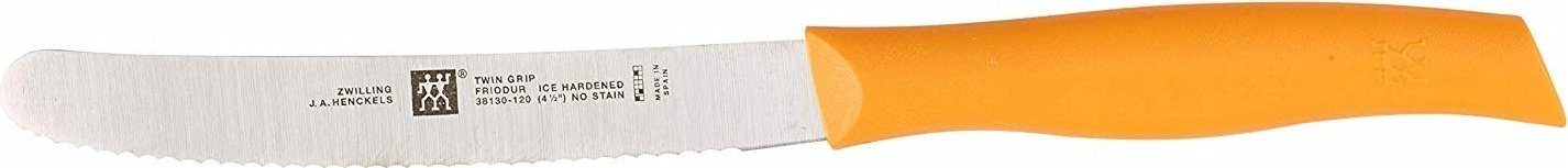 This TWIN Grip utility knife has an easy-to-grip handle, ergonomic design for kitchen tasks that require knives for finer or smaller tasks including chopping herbs, cutting, slicing or paring fruits and vegetables. Designed with a molded, slip-resistant synthetic resin handle for comfortable control. The "NO STAIN" stainless steel blade provides excellent cutting performance.