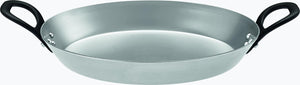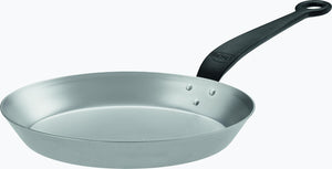 Traditional forged iron frying pan incorporating a welded handle with hook. Can be used on an open fire or grill. Also suitable for serving