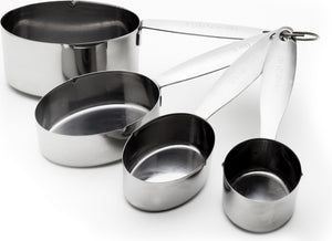 This handy and sturdy stainless steel measuring cup set is built to last a long time. This set is secured with a metal ring so that the measuring cups won't be misplaced.