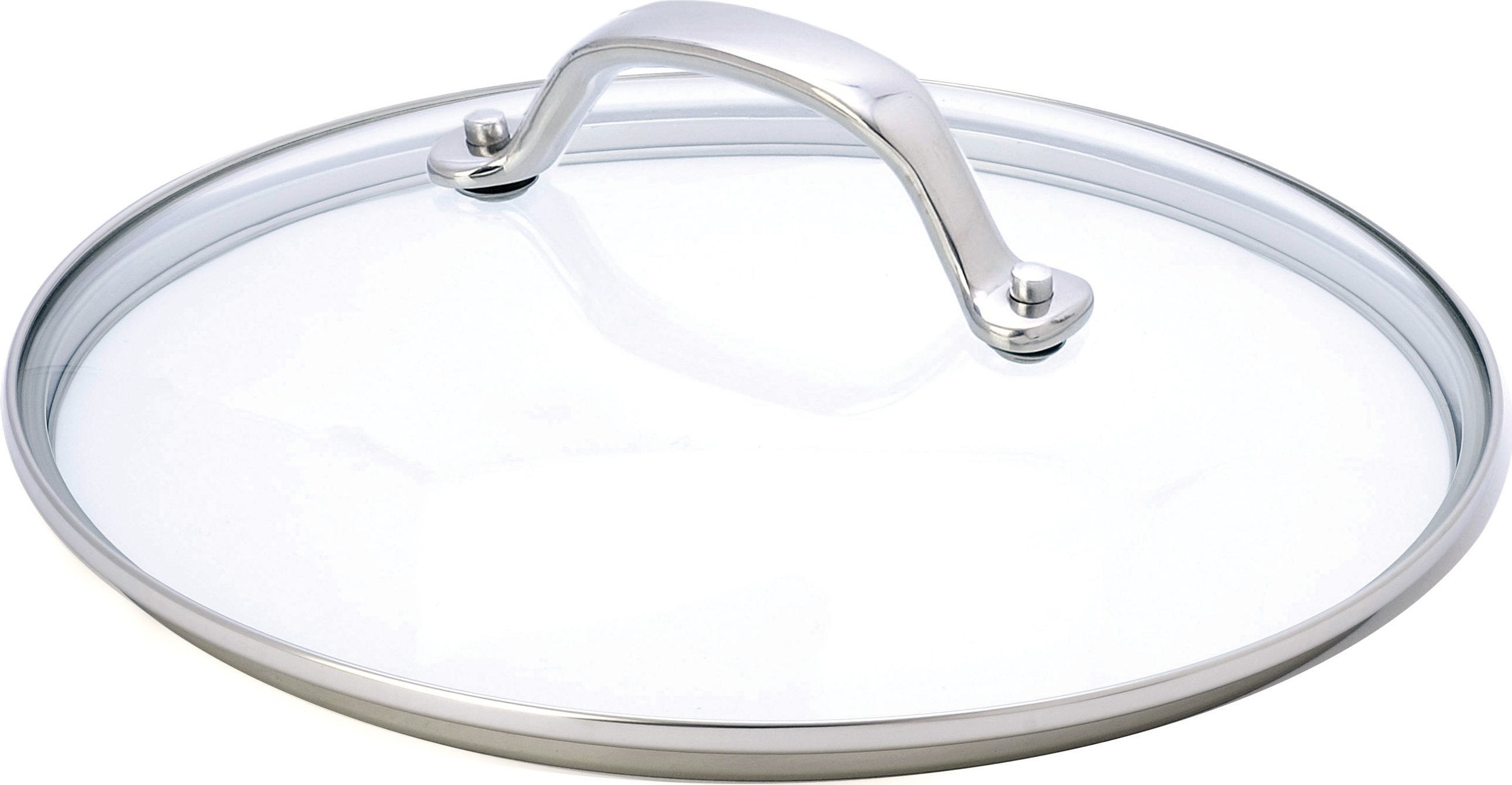 Tempered glass cover with riveted cast handle and stainless steel protector rim.
