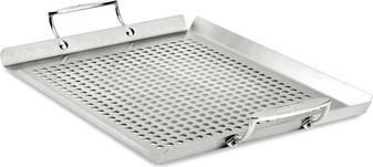 Large perforations add smoky flavour to a wide range of smaller foods. Safe for use with all utensils. Over-sized handles are riveted to the pan for easy handling, even when wearing mitts.